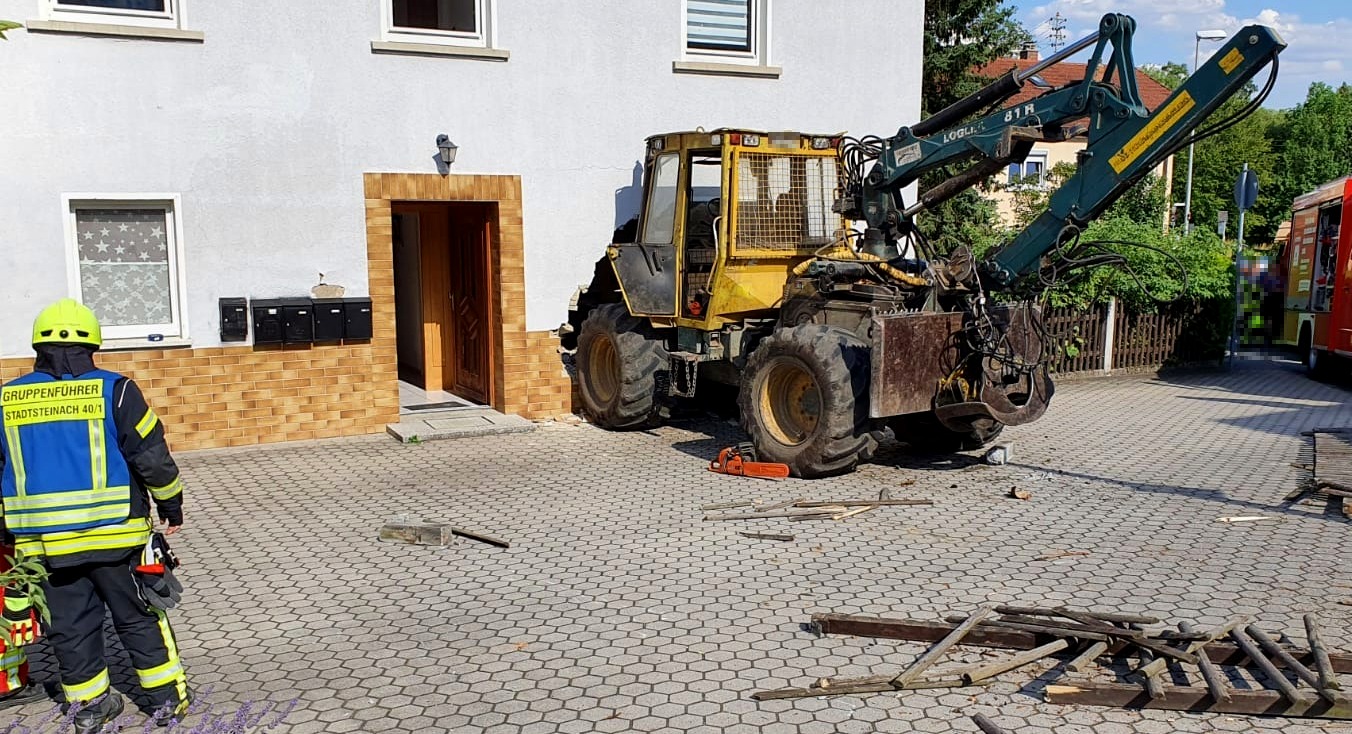Aus noch ungeklärter Ursache geriet ein forstwirtschaftliches Fahrzeug auf einer Gefällstrecke in Untersteinach außer Kontrolle. In einer Rechtskurve überrollte das Arbeitsgerät einen Gartenzaun und durchbrach schlussendlich eine Hausmauer.